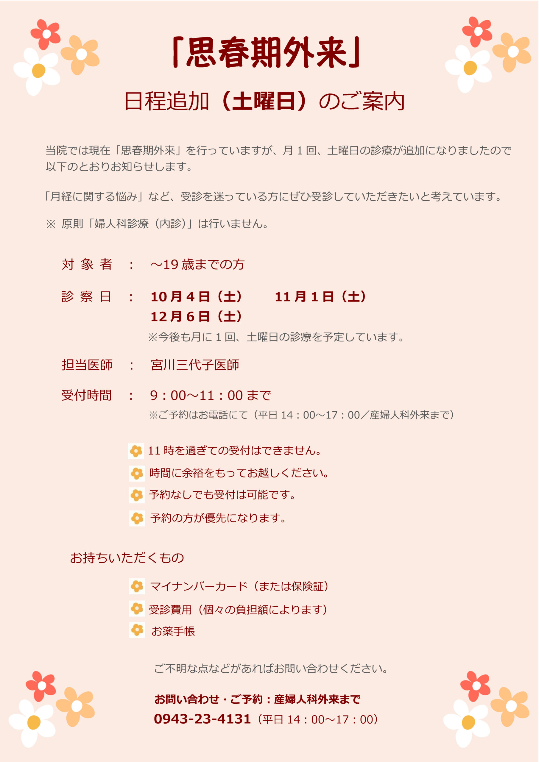 「思春期外来」日程追加(土曜日/月1回)のお知らせを更新しました。