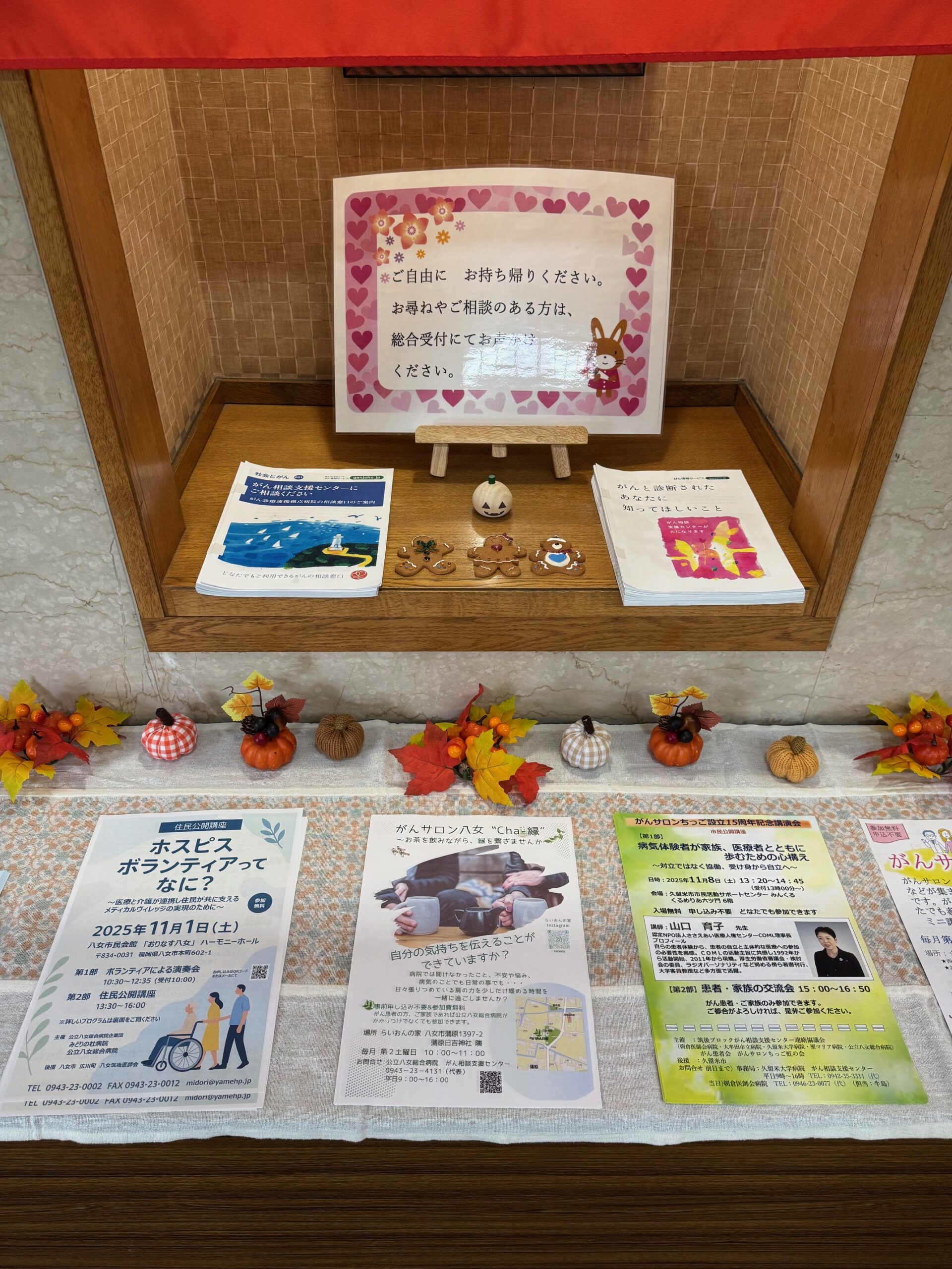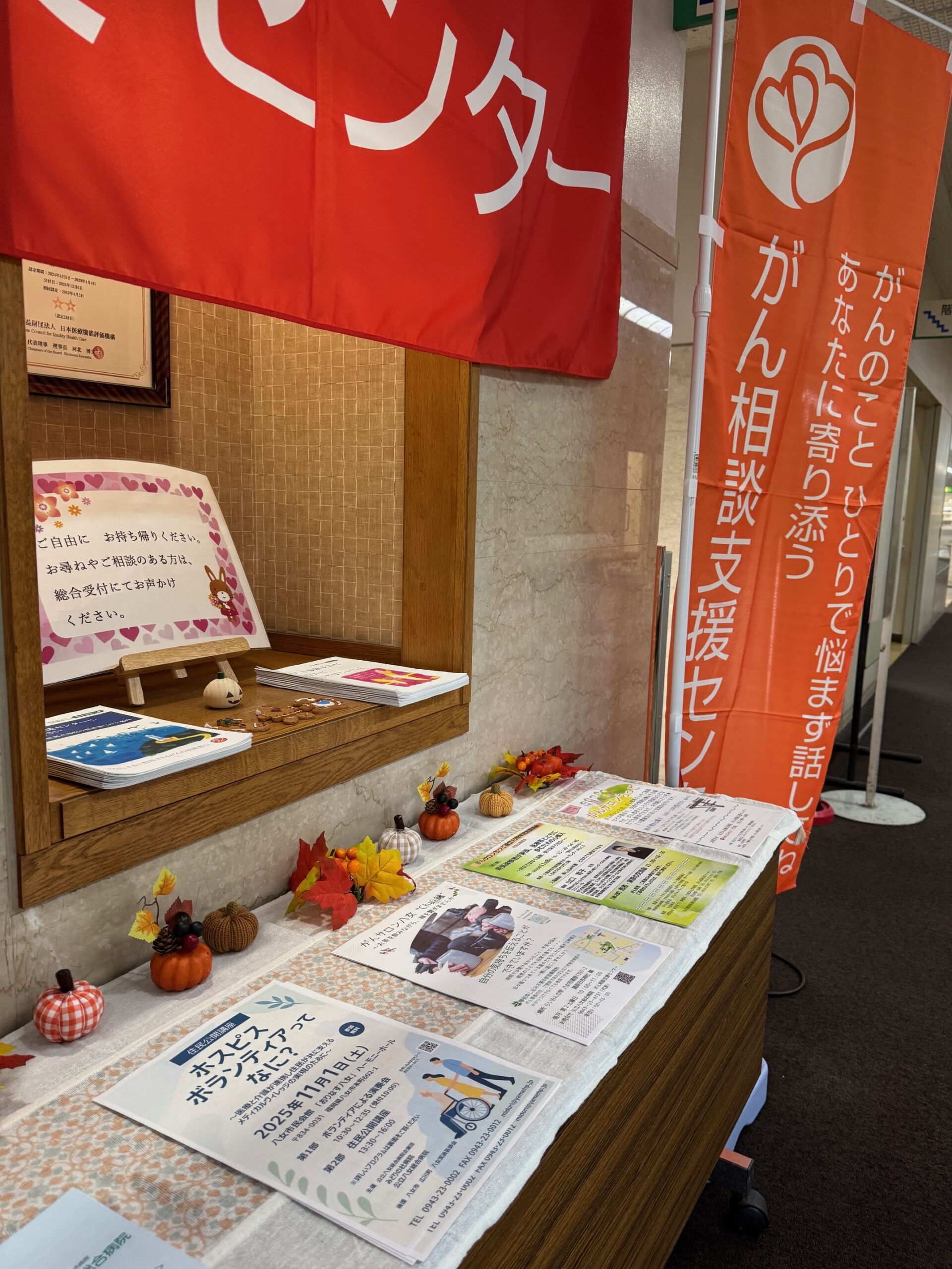 現在、当院の1階受付ブース付近にて「がん相談支援センター」に関する特設コーナーを設置しています。 資料の展示見学や動画視聴ができますので、当院へお越しの際は是非お立ち寄りください。掲示期間は10月20日(月)~24日(金)の9:00~16:00です。
