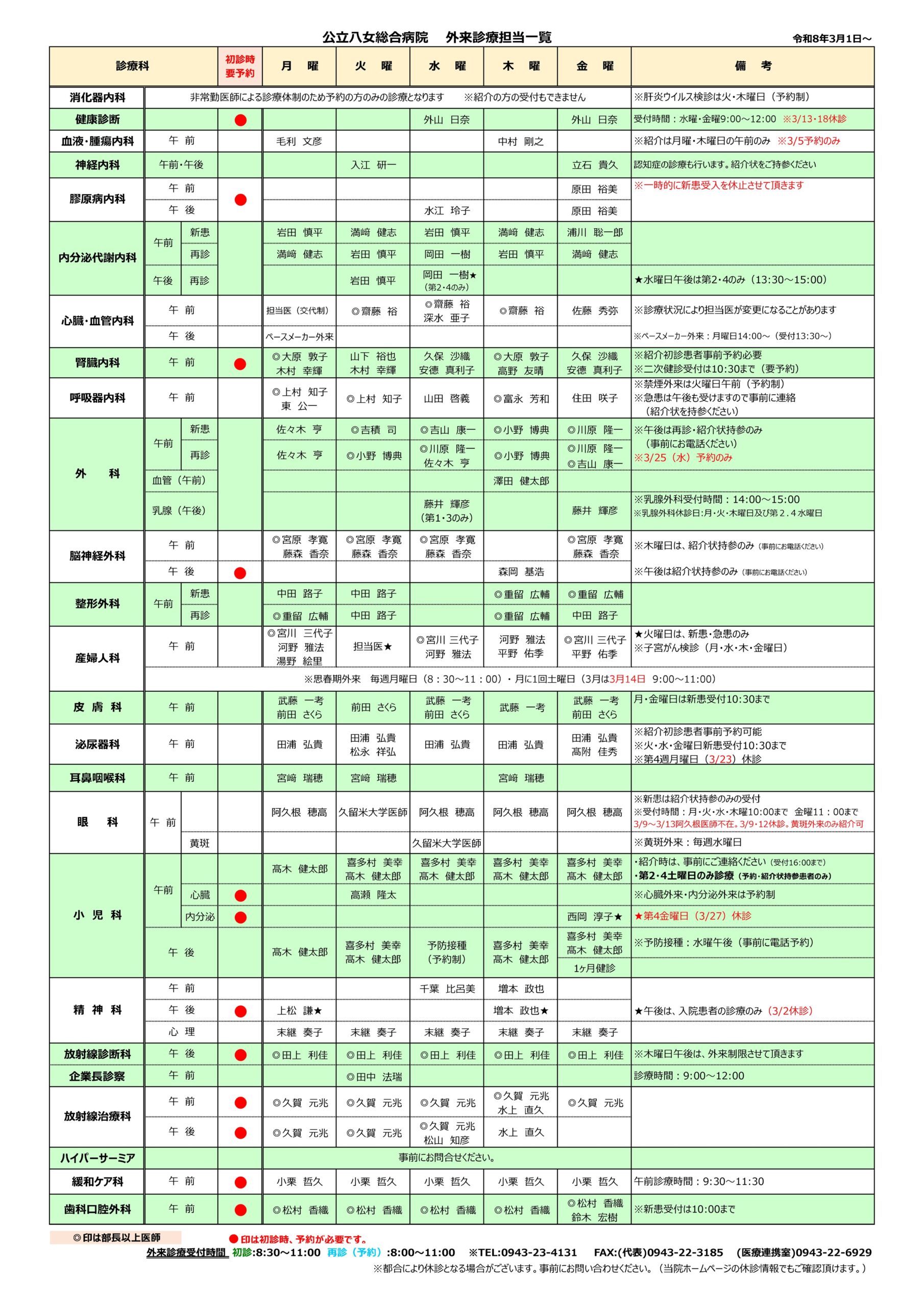 外来診療担当一覧表