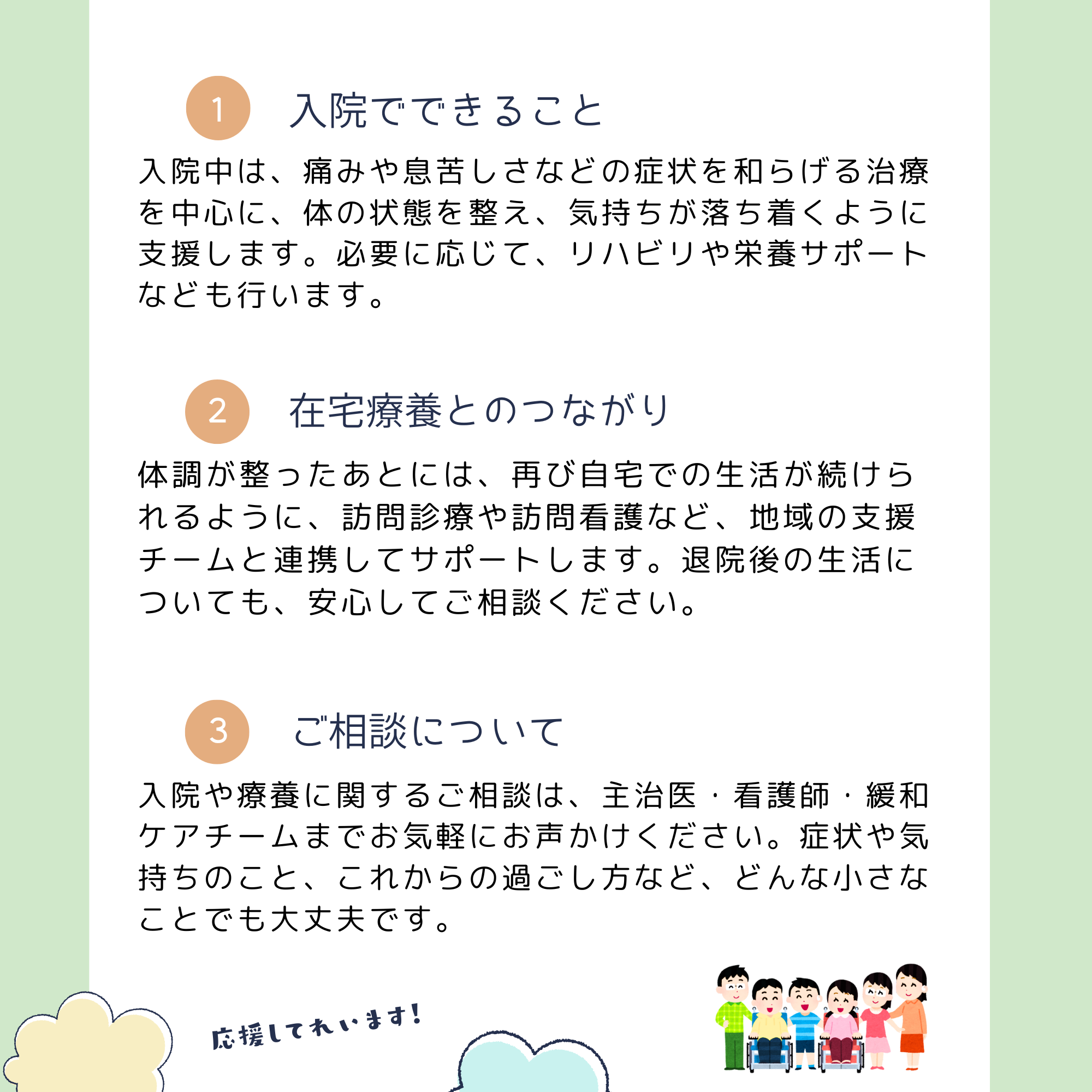 ~安心して過ごすために~ 痛みや息苦しさを我慢せず、つらさは早めに和らげましょう。一時的に入院して体を 整えることで、また安心して自宅で過ごせることもあります。 自宅と病院、どちらも上手に使いながら、あなたらしい時間を大切にしていきましょ う。