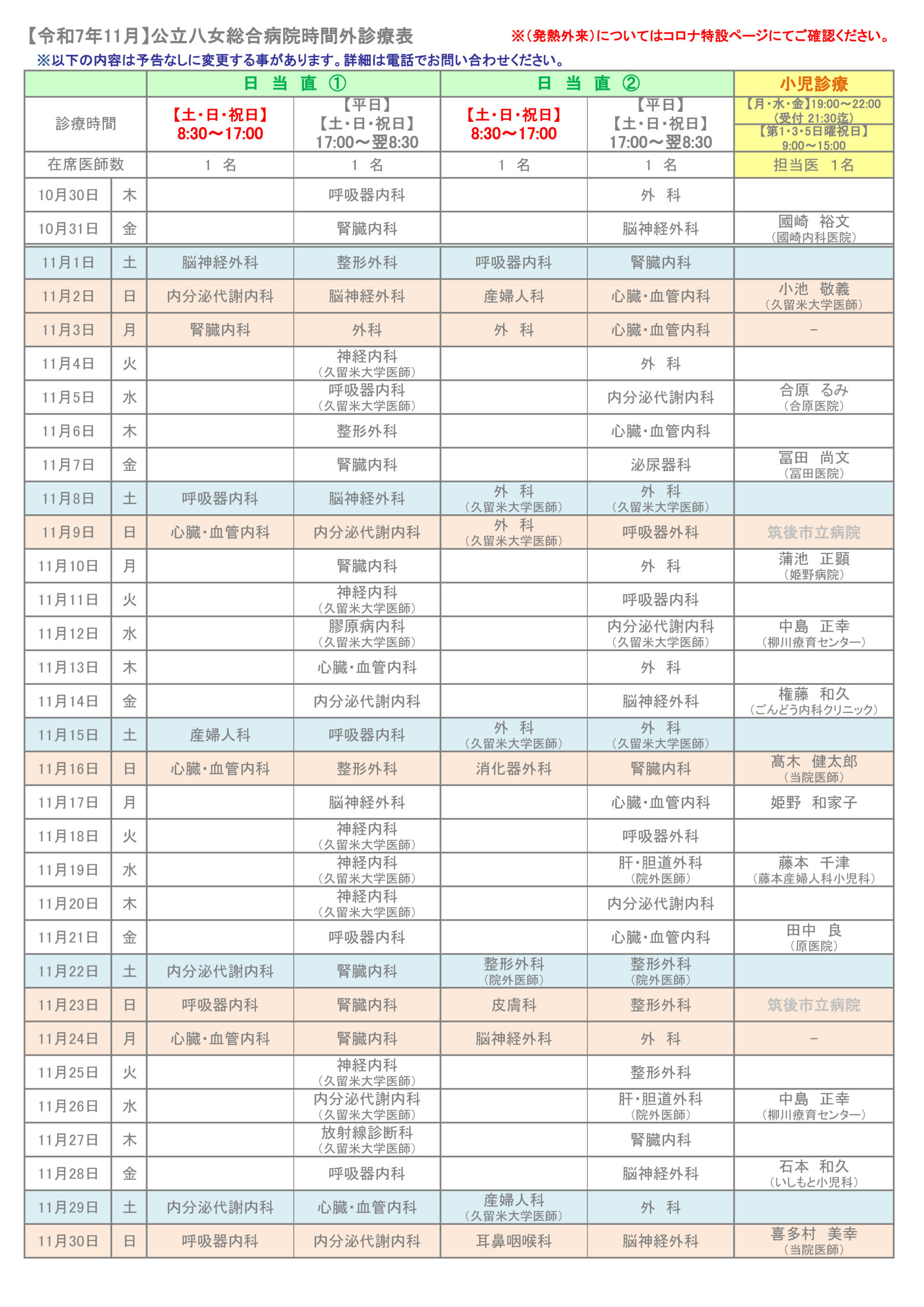 Off duty hours時間外診療一覧表(毎月更新)