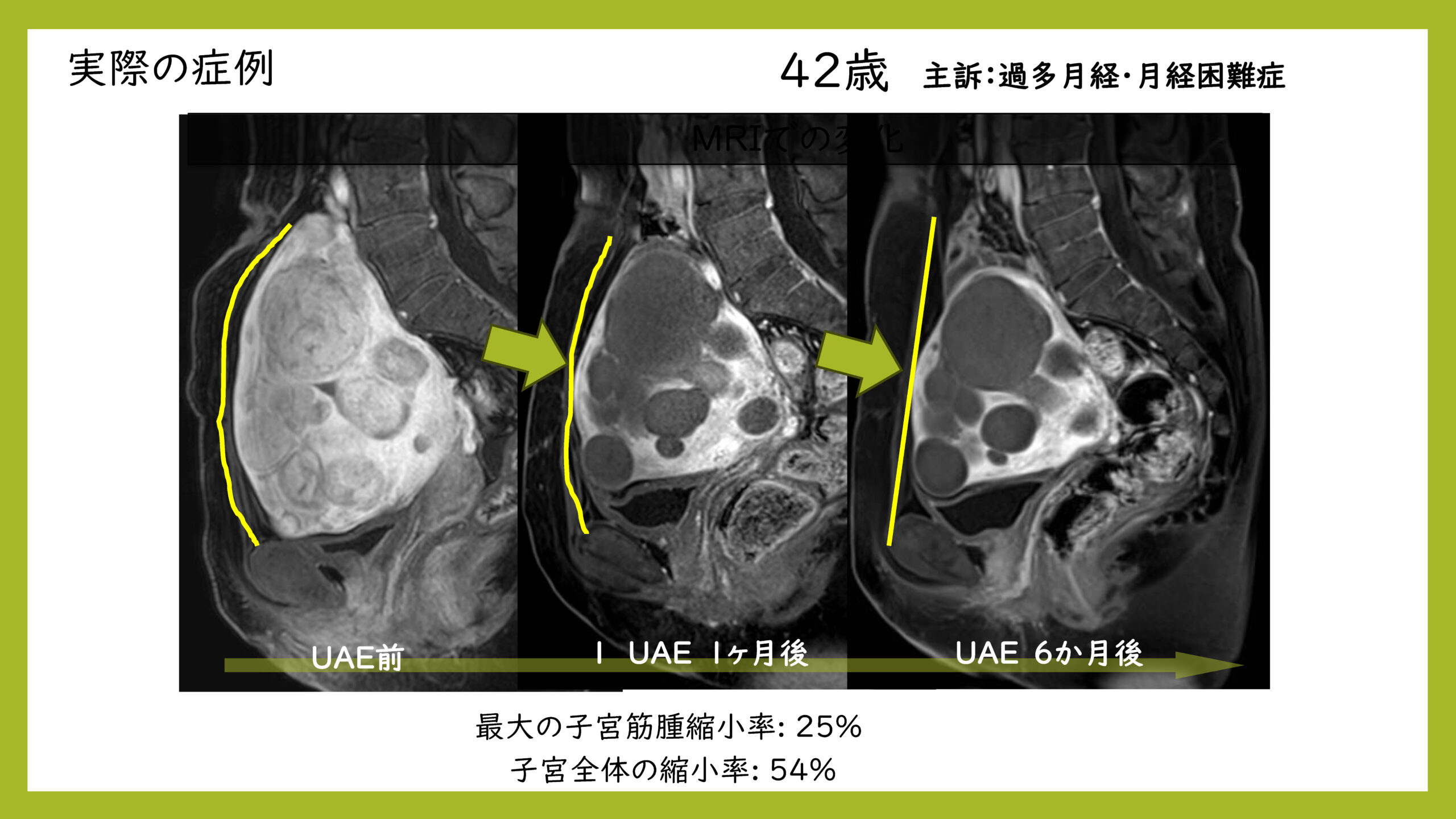 1. 当院の産婦人科を受診 ⇩ 2. 造影MRI検査等 ⇩ 3. 治療が可能と診断を受けた場合 当院の放射線科から⇒久留米大学放射線科へ連絡(IVR専門医師へ依頼)当院での実績について