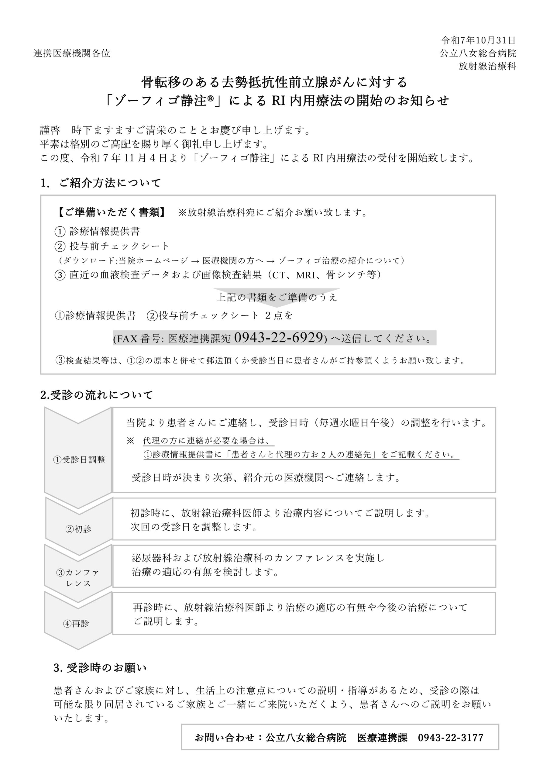 この度、令和7年11月4日より「ゾーフィゴ静注」によるRI内用療法の受付を開始致します。 当院では事前に泌尿器科および放射線治療科のカンファレンスにてゾーフィゴ治療の適応を確認しています。 事前に下記の書類をご準備頂き「放射線治療科」へご紹介頂きますよう宜しくお願い致します。